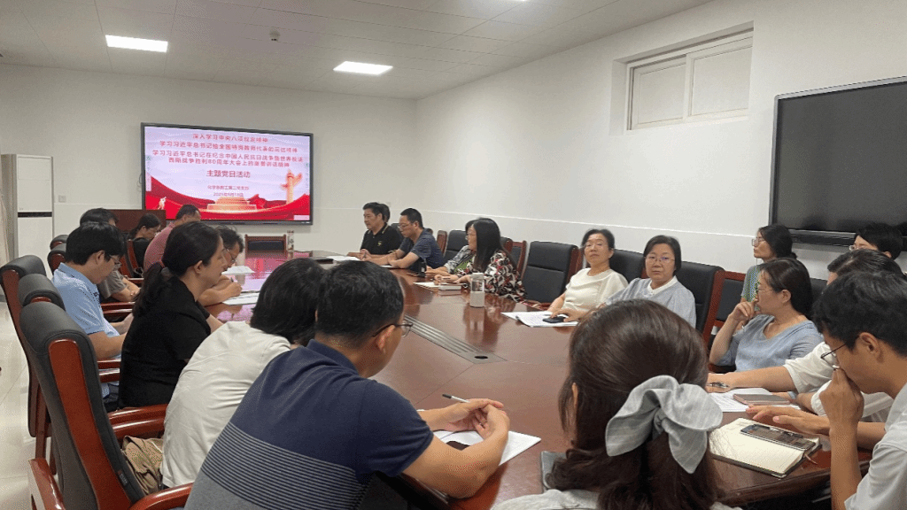(通讯员:丁聪)9 月 18 日下午,化学系教工第一党支部在化学楼 A106 会议室开展了支部书记讲党课暨主题党日活动。支部全体党员、有机化学与物理化学课程组非党员教师代表参加了此次学习活动。活动由支部书记曹敏惠主持。宣传委员丁聪领学了习近平总书记在纪念中国人民抗日战争暨世界反法西斯战争胜利 80 周年大会上的重要讲话精神。通过 “数字故事 + 金句研读” 的形式,与会教师重温了 “天下兴亡、匹夫有责的爱国情怀,视死如归、...