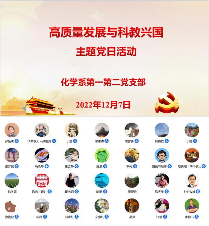(通讯员:罗艳珠)为了进一步深入学习、宣传和贯彻党的二十大精神,2022年12月7日下午,化学系教工第一、第二党支部开展“高质量发展与科教兴国”主题党日活动。本次活动在腾讯会议平台线上举行。会议由化学系第二党支部书记梁建功同志主持。