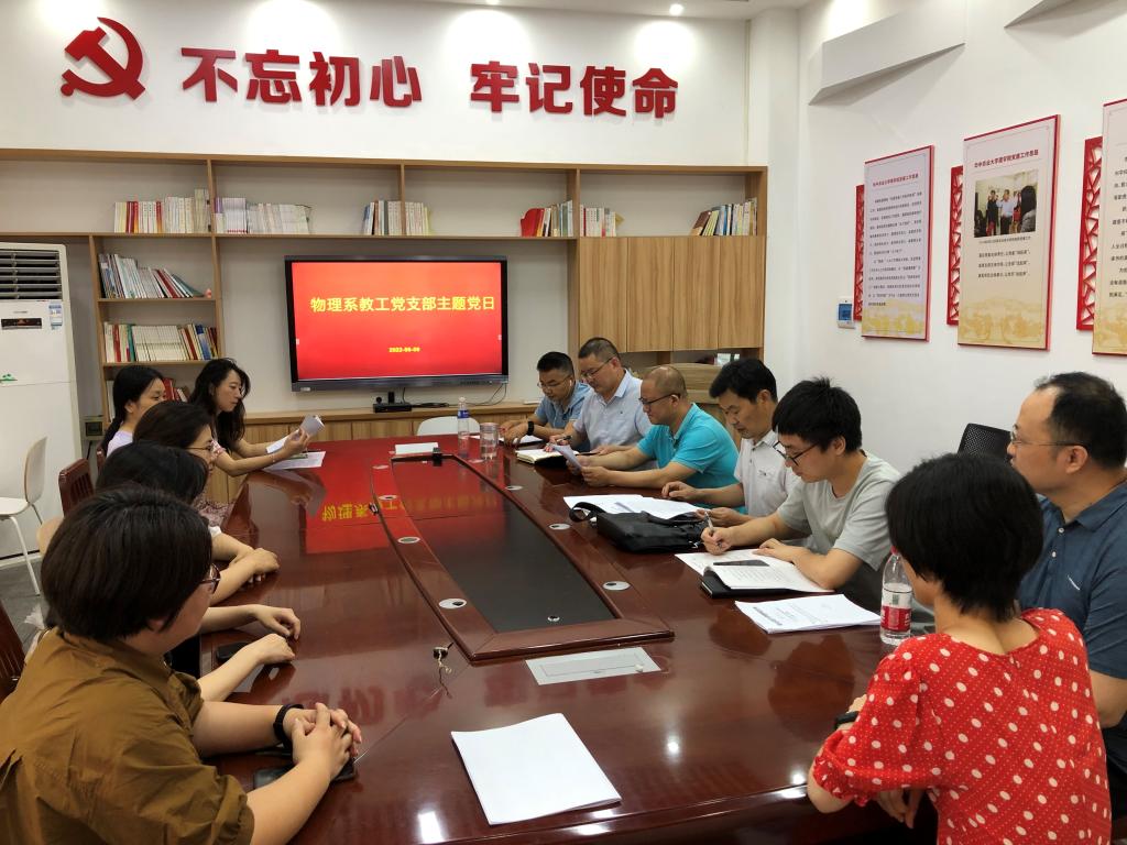 (通讯员:后德家)2022年6月9日下午,物理系教工党支部在逸夫楼B109开展主题党日活动,会议由支部书记陈建军主持。