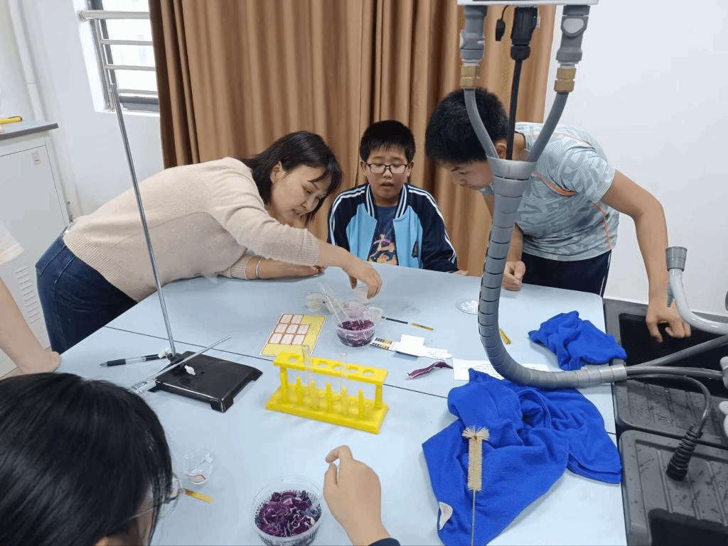 4月10日,在华农附校实验室,段老师带领七年级同学们进入“神奇的酸碱变色反应”课堂:学生动手用蔬菜紫甘蓝自制酸碱指示剂,滴加到食醋、雪碧、食盐、洗衣粉、食用碱溶液中,对比溶液秒变深浅不一的红色和蓝色;合作完成“桃花朵朵开”,探索酚酞指示剂遇碱变红色的奥秘。在同学们有了直观认识后,段老师结合实践讲解了“药物治疗胃酸过多”、“家用清洁用品去污原理”、“蜜蜂蛰了用肥皂水涂抹”等这些生活现象背后的化学知识原理,同学们表示收获颇丰。