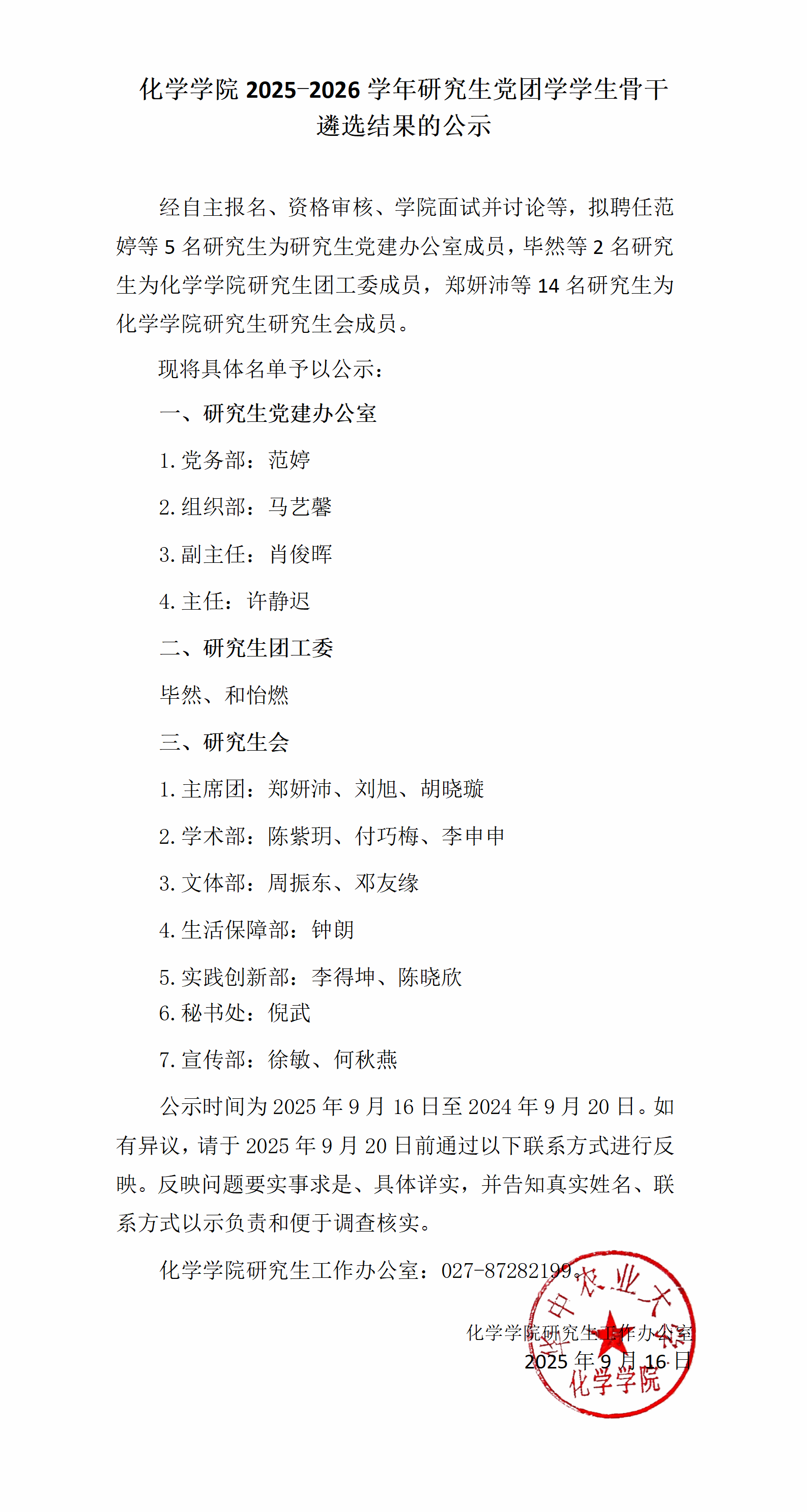 yl9193永利集团2025-2026学年研究生党团学学生骨干遴选结果的公示