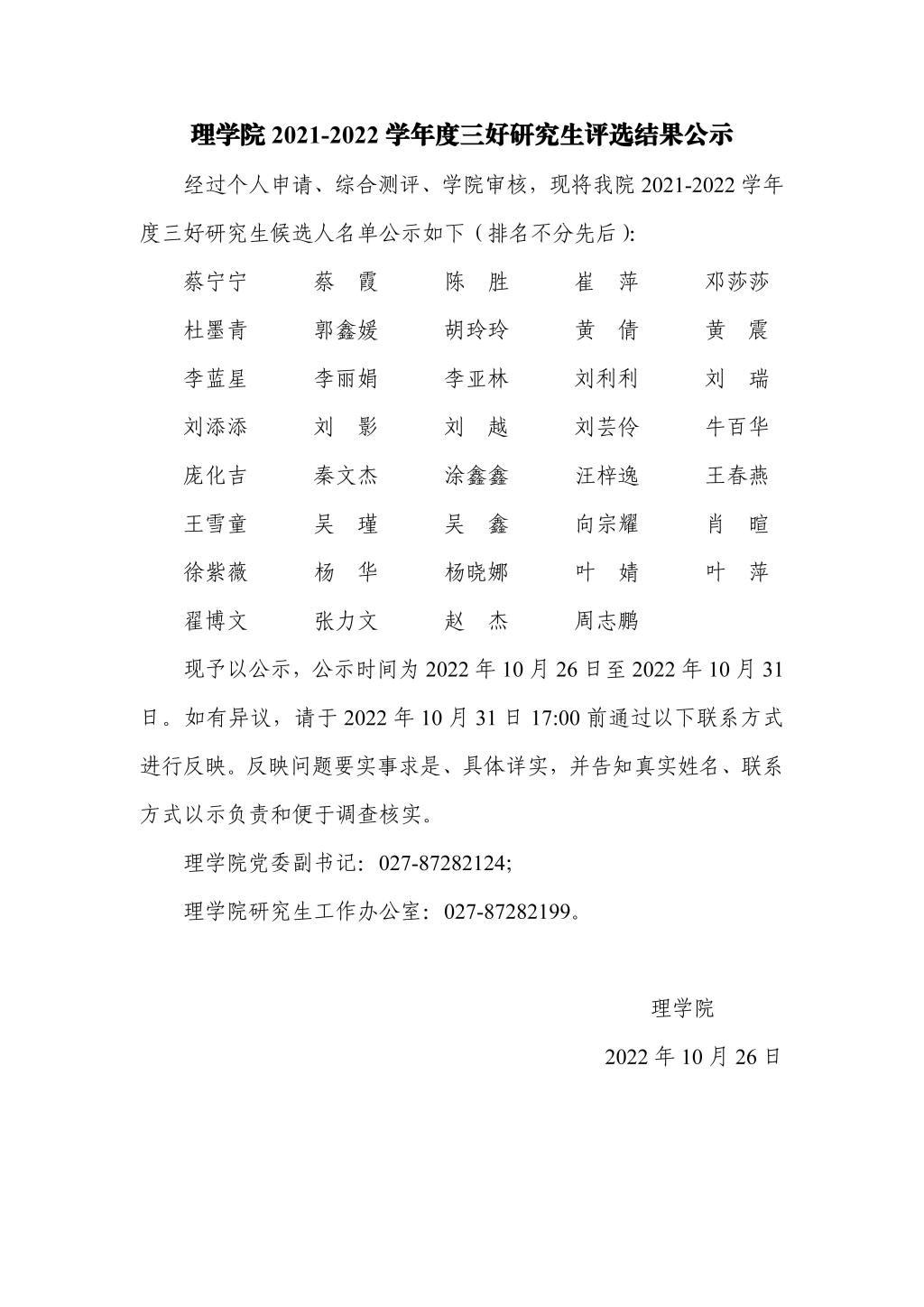 理学院2021-2022学年度三好研究生评选结果公示