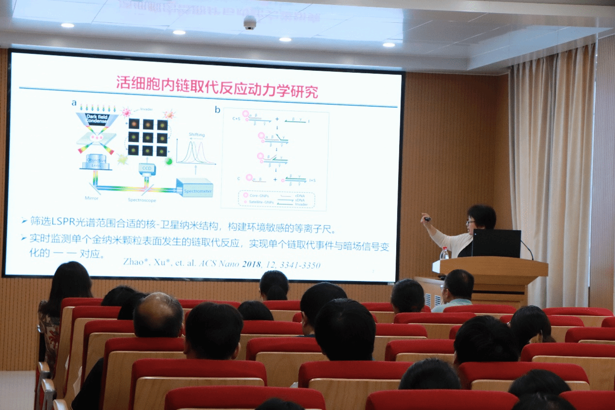 报告中,徐静娟教授以《单细胞成像》为题,重点介绍了其团队在单细胞成像技术上的创新突破。报告深入解析了多种高灵敏成像方法,包括局域表面等离子体共振散射成像、热调制散射成像及电调制干涉散射成像。徐静娟教授特别阐述了精巧设计的纳米探针(如“Au核卫星结构”)的核心作用,这些微小探针能高效进入细胞内部,其光学性质随微环境变化而灵敏响应,实现对细胞内目标分子的精准探测。在互动环节,徐静娟教授与在场师生就成像方法选择、热传导测量技术难点等议题开展深入交流与探讨。现场气氛热烈,学术氛围浓厚。此次报告为师生搭建了高端学术交流平台,对拓宽科研视野、推动学科交叉融合具有重要启发意义。