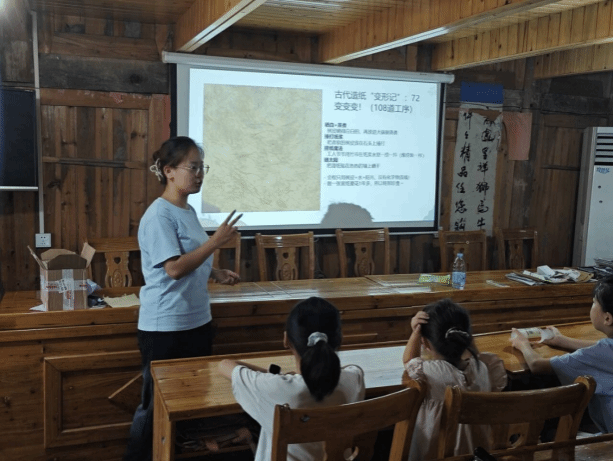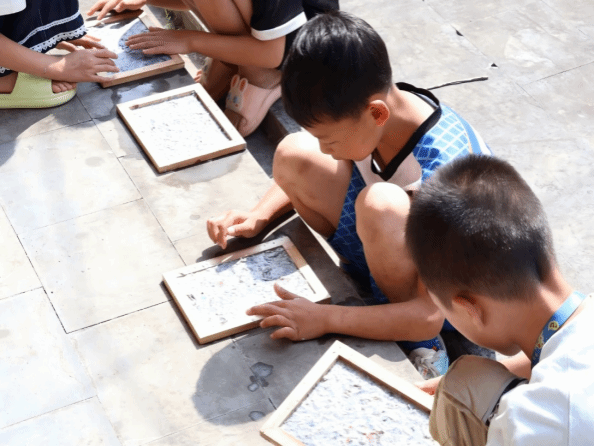将知识竞赛与实践体验结合,让一场 “传统文化大比拼” 点燃热情。 成语接龙大战里,由实践团队成员出题,小朋友们30秒头脑风暴疯狂输出,背诵经典诗词、典故,在竞赛中感受传统文化魅力。 实践队员还化身 “传统文化魔法师”,带着小朋友们钻进四大发明之造纸术的奇妙世界。 小朋友们小组合作,通过泡纸、捣碎、捞纸等步骤,深入了解了有着1200年历史的宣纸。
