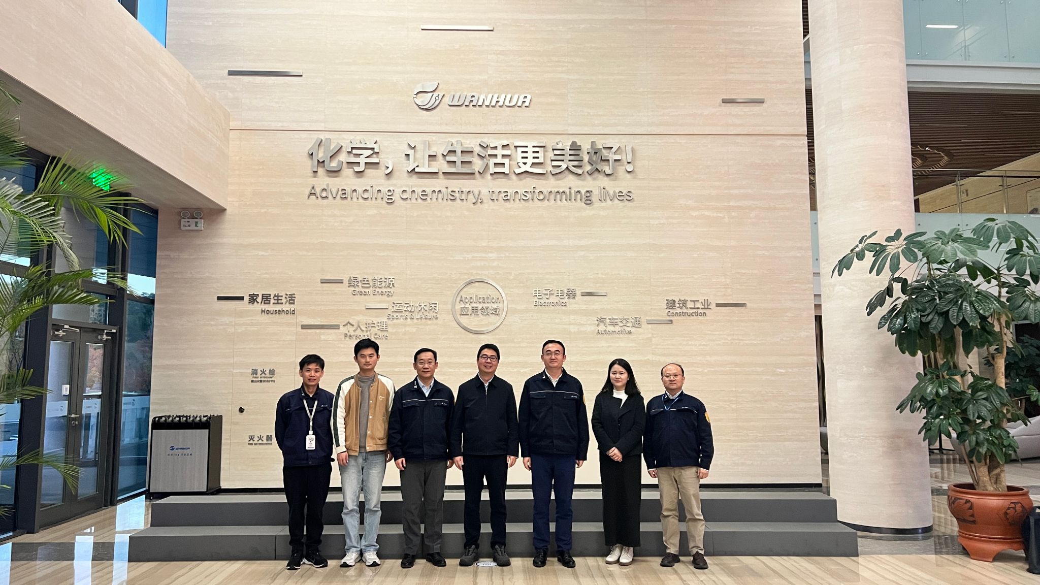 在万华化学集团,我校校友、人力资源部总经理白珍伟、人力资源部招聘经理白朔、聚氨酯优化中心研发工程师金振宇、法国PDC公司研发工程师王暖程等热情接待了陈华伟一行。