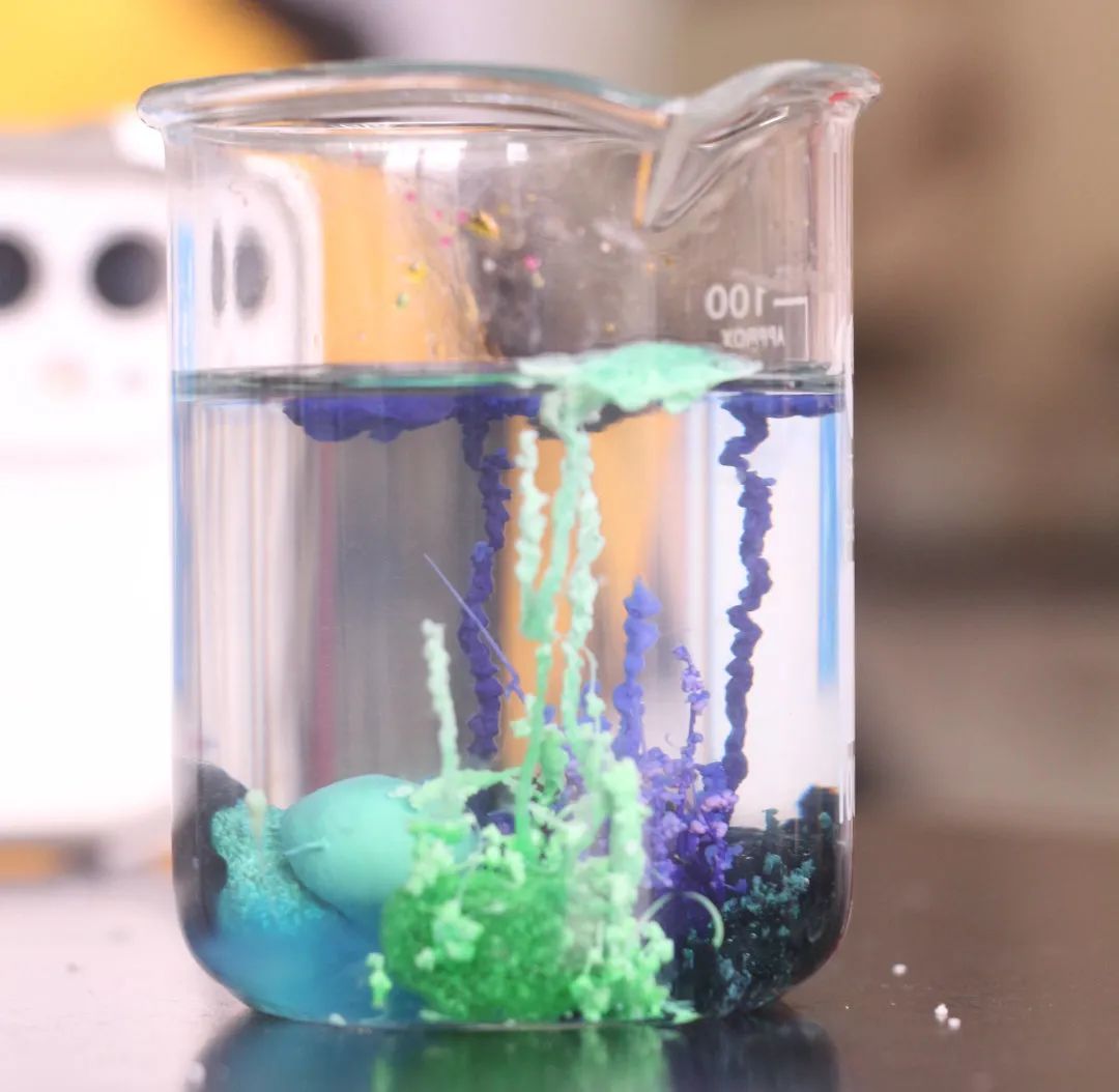 该实验操作简单,但是需要耐心等待。配备好硅酸溶液后,每加入一种金属盐都需要等待相应硅酸盐树枝产生,之后再加入另一种金属盐。最终的现象会因为加入的金属盐不同而不同,色彩都十分绚丽。