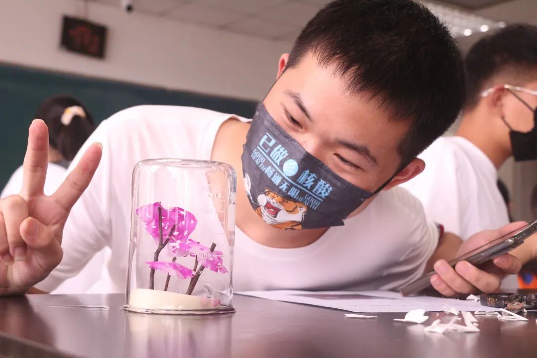 此次活动,一共有两个趣味实验。第一个实验“桃花盛开”,实验原理是酚酞遇到碱性物质就会变成红色,本次实验的现象主要来源于涂抹在滤纸小花上的酚酞遇到烧杯壁上易挥发的浓氨水变红。