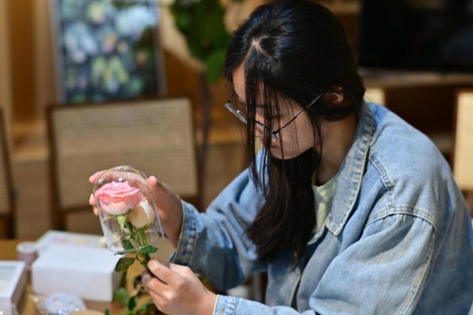 手拿成品的一位同学说:“整个活动过程我感觉非常享受,看见鲜花心情也是很开心的,最后的成品也很美,很有价值。活动的主题是让浪漫留住春天,这个idea真的好浪漫!很感谢这次活动的举办,让我收获了浪漫且有趣的一天。”