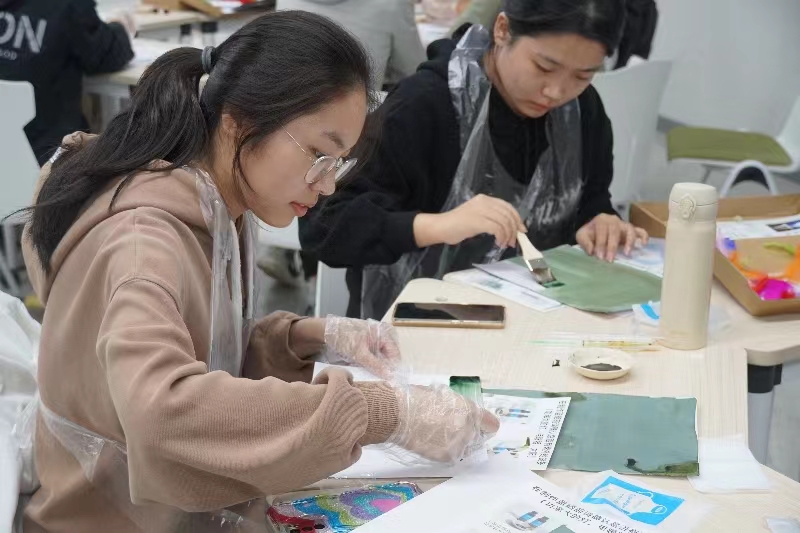 “大家知道什么是蓝晒吗?”“光和普鲁蓝之间存在什么样的关系?”活动现场,田雨饶有兴致地向同学们介绍了蓝晒的原理、由来和工艺应用,她谈到,蓝晒是一种传统而又独特的成像工艺,主要是利用紫外线作为催化剂,氧化柠檬酸铁铵和铁氰化钾的混合溶液中的二价铁离子产生普鲁蓝,从而实现曝光成像,成品与中国传统手工艺蓝染有着相似的面貌。田雨向同学们展示了“蓝晒”与“蓝染”的不同技艺和制作过程,并指出,“蓝晒”与“蓝染”一个是有百年历史的成像工艺,一个是历经千年的染色技术,二者巧妙地呈现出相似的效果,跨越时空和地域,既有差异又包含着千丝万缕的联系,展现出艺术的创造力。