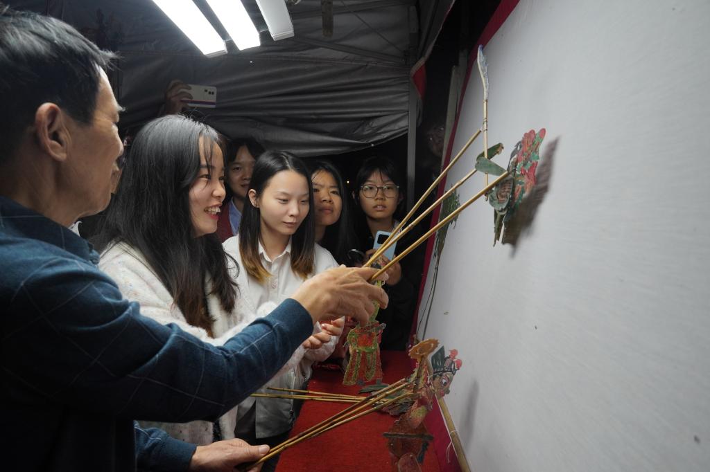 曲罢戏终,襄苑皮影戏第四代传承人郝运平带领五名表演队成员从幕后走到台前,与在场师生进行了亲切交流。同学们热情高涨,对皮影戏人物的制作和表演充满了好奇,纷纷提问和互动。“我从十几岁就开始学习皮影戏,从皮影人物的制作与操控学起,努力推进皮影戏传统文化的创新发展。”郝运平不仅参与经典剧目的演出,也会结合时代背景,创作出贴近生活的现代剧目。“传统文化的传承不仅包含延续,也应有革新,这样才能让文化真正地活起来。”话毕,现场响起了热烈的掌声。最后,同学们在表演队老师的带领下亲自体验了皮影的操作,同学们拿着各色皮影人物,有的仔细观察,有的好奇地伸手去触摸,有的认真跟着老师学习皮影的操作方法。