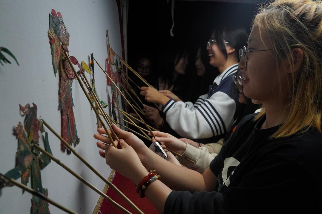 正当同学们意犹未尽时,剧目《红灯记》选段又紧接着开始了,“听罢奶奶说红灯,讲革命英勇悲壮,”慷慨激昂的唱腔,一下就把同学们拉回了革命年代,先烈们英勇无畏、从容赴死的精神让人动容。最后,皮影戏演出由传统武打表演收尾,皮影人物色彩各异,拿上武器,在幕上飞舞,精彩得让人移不开眼。“呼”的一声,幕上人物消失,同学们屏气凝神地期待,片刻后,人物登上各自的战马出现在幕布上,一会儿双枪对打,一会儿纵马飞腾,引得同学们直呼过瘾。