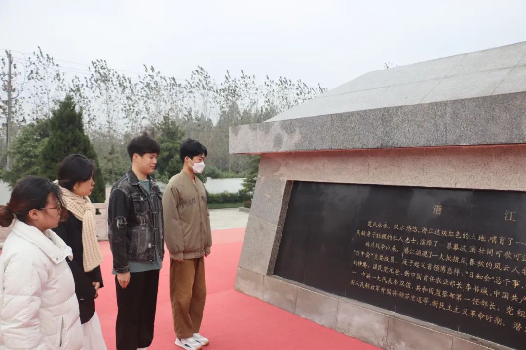 绿树环绕的烈士陵园庄严肃穆,革命烈士纪念碑巍然矗立。学生党员王志博声情并茂地讲述了潜江革命先烈的故事:从辛亥先驱到第一批共产党战士 李书城、李汉俊等人的故事,从在李书城的寓所召开的中国共产党第一次全国代表大会到熊口红军街,革命的星星之火在潜江燃烧照亮。胡先文补充道,1922年,作为中共一大代表的李汉俊回武汉组织学生、工人开展革命活动,1927年被反动军阀杀害,年仅37岁。不仅如此,贺龙、钱瑛等老一辈无产阶级革命家于1931年带领红军在潜江熊口镇取得第三次反“围剿”胜利。聆听了革命者的光荣事迹,在场的同学无不肃然起敬,纷纷与胡老师分享起自己家乡的革命者的故事。