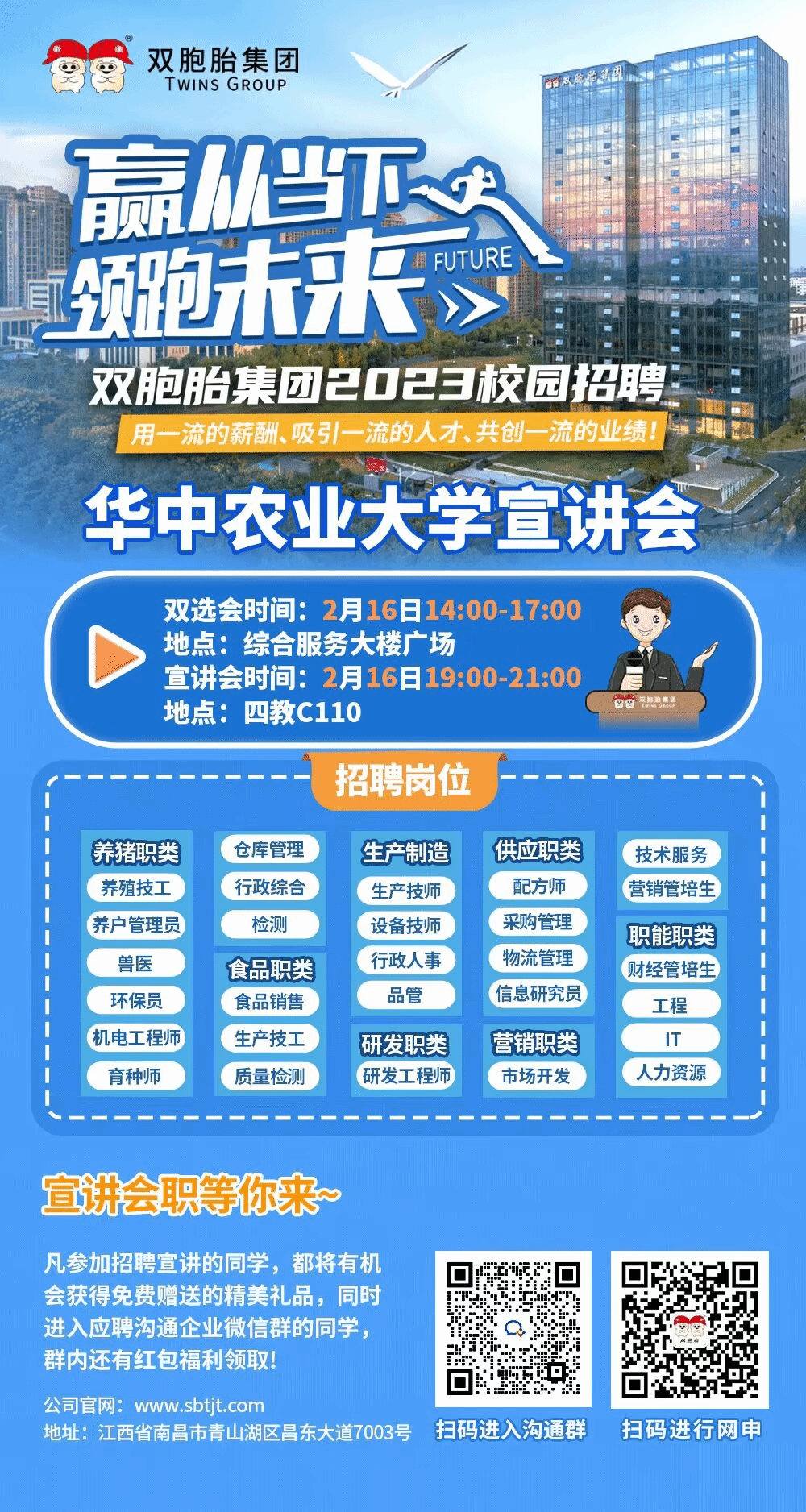 应聘方式:关注#双胞胎集团招聘#微信公众号,进行网申投递,提前锁定意向岗位