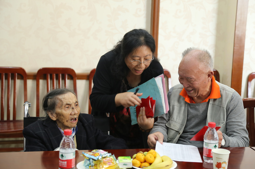 听完陈浩院长的介绍,退休教职工们发言老教师纷纷表达了对学院关怀的感谢,并为理学院近年来取得的可喜成绩感到高兴,不少老教师还就理学院将来的事业发展提出了宝贵的建议,并表示将继续为理学院事业发展提供力所能及的帮助。座谈会上,志愿者们还为今年正值80和85整岁的三位老教师献上了鲜花和深切的祝福,学院也为每个退休教师发放了慰问金。