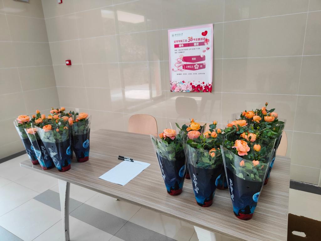 活动现场,一盆盆月季花整齐地摆放着,似乎在等待着主人的到来。女教职工、女同学通过捐赠两本符合要求的图书,从志愿者手中领取一盆精美的月季花,用“花香换书香”吸引了三十多位女教职工和同学们前来参与。短短一个小时,预先准备的45盆月季花被换购一空。