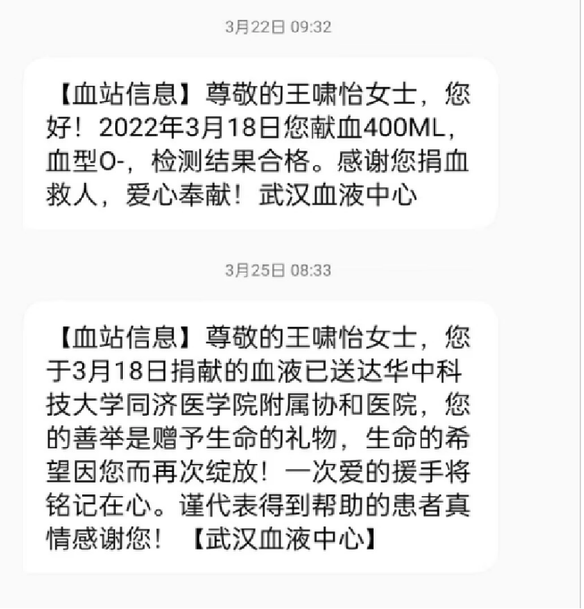 作为全国占比不到0.1%的O型稀有血型者,王啸怡积极联系武汉血液中心,成为武汉市稀有血型之家会员,投身到无偿献血中,成为大家口中的“熊猫大侠”。1600cc点亮生命之光,点燃生命希望。