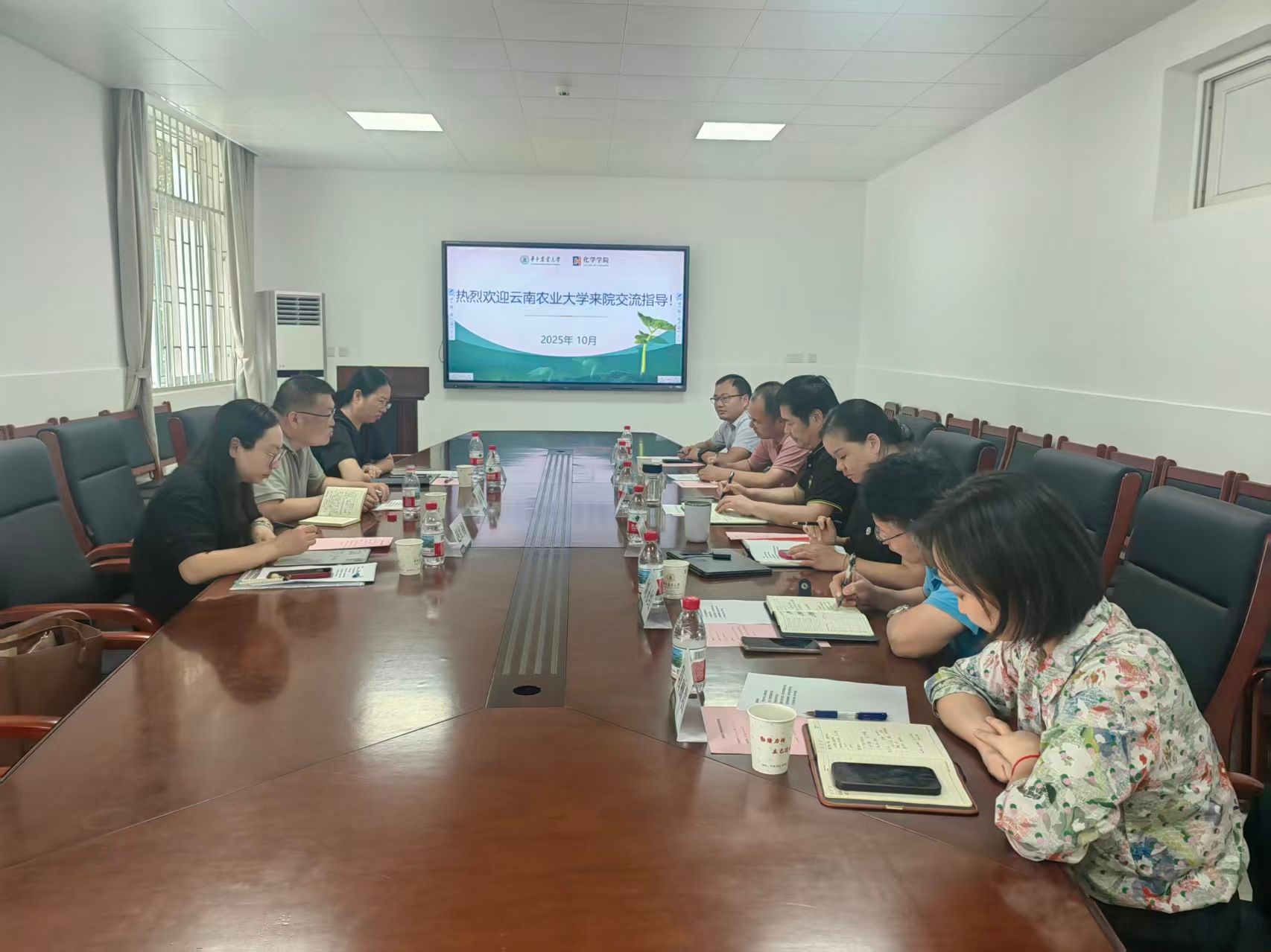 (通讯员:杨晨茹)10月9日上午,云南农业大学理学院院长陆自强教授一行三人来我院调研交流。学院党委书记涂俊才、副院长曹敏惠教授、化学系班子成员及教师代表参加座谈。会议由副院长曹敏惠主持。