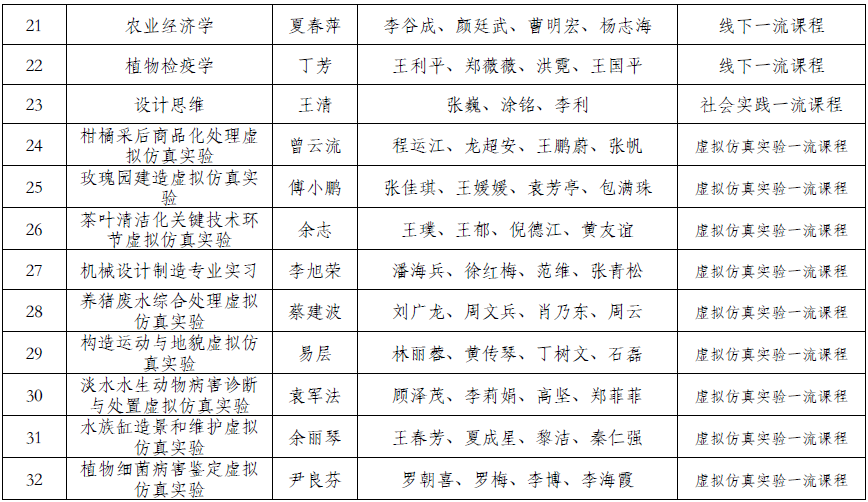 (通讯员:柳晓珊)近日,湖北省教育厅发布了《省教育厅关于公布2022年度省级一流本科课程认定结果的通知》(鄂教高函〔2022〕16号),我校有32门课程被认定为2022年度省级一流本科课程。其中,线上一流课程7门、线上线下混合式一流课程6门、线下一流课程9门、社会实践一流课程1门、虚拟仿真实验一流课程9门。