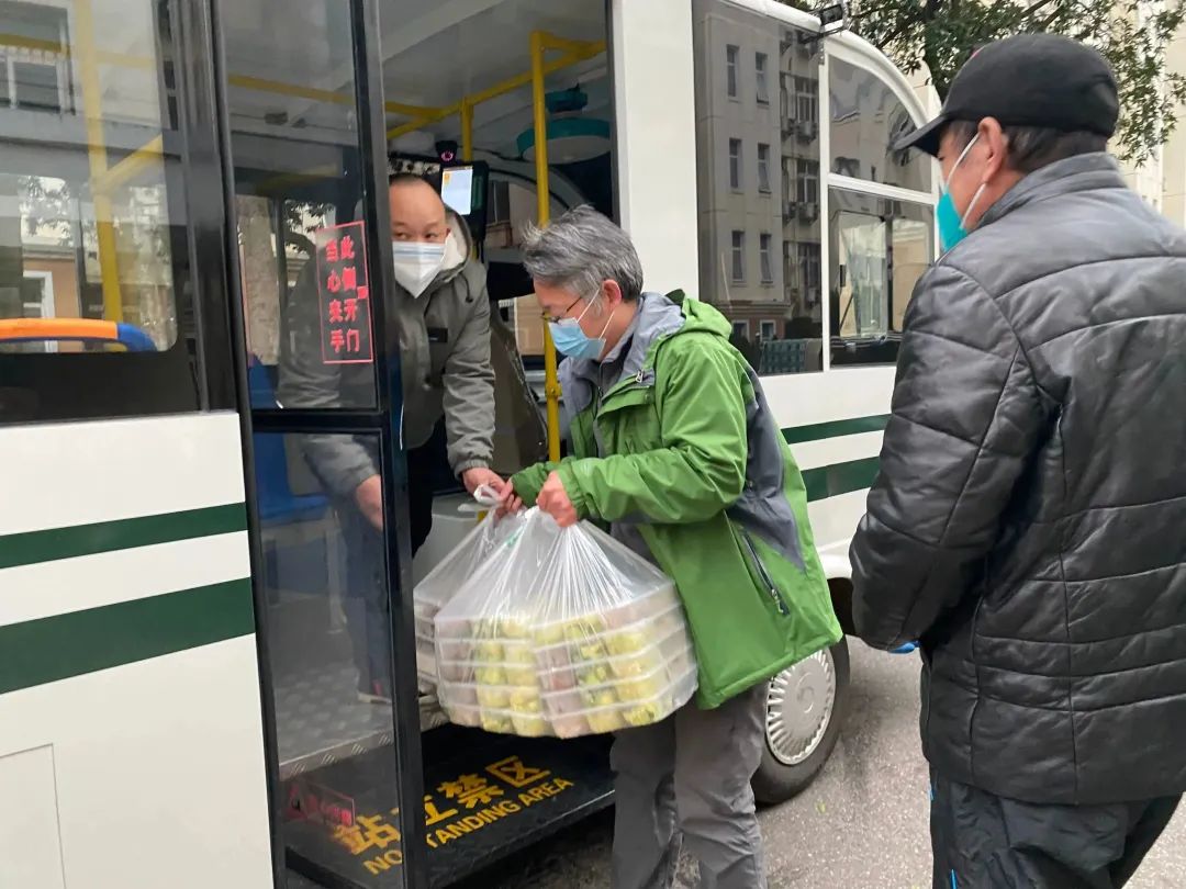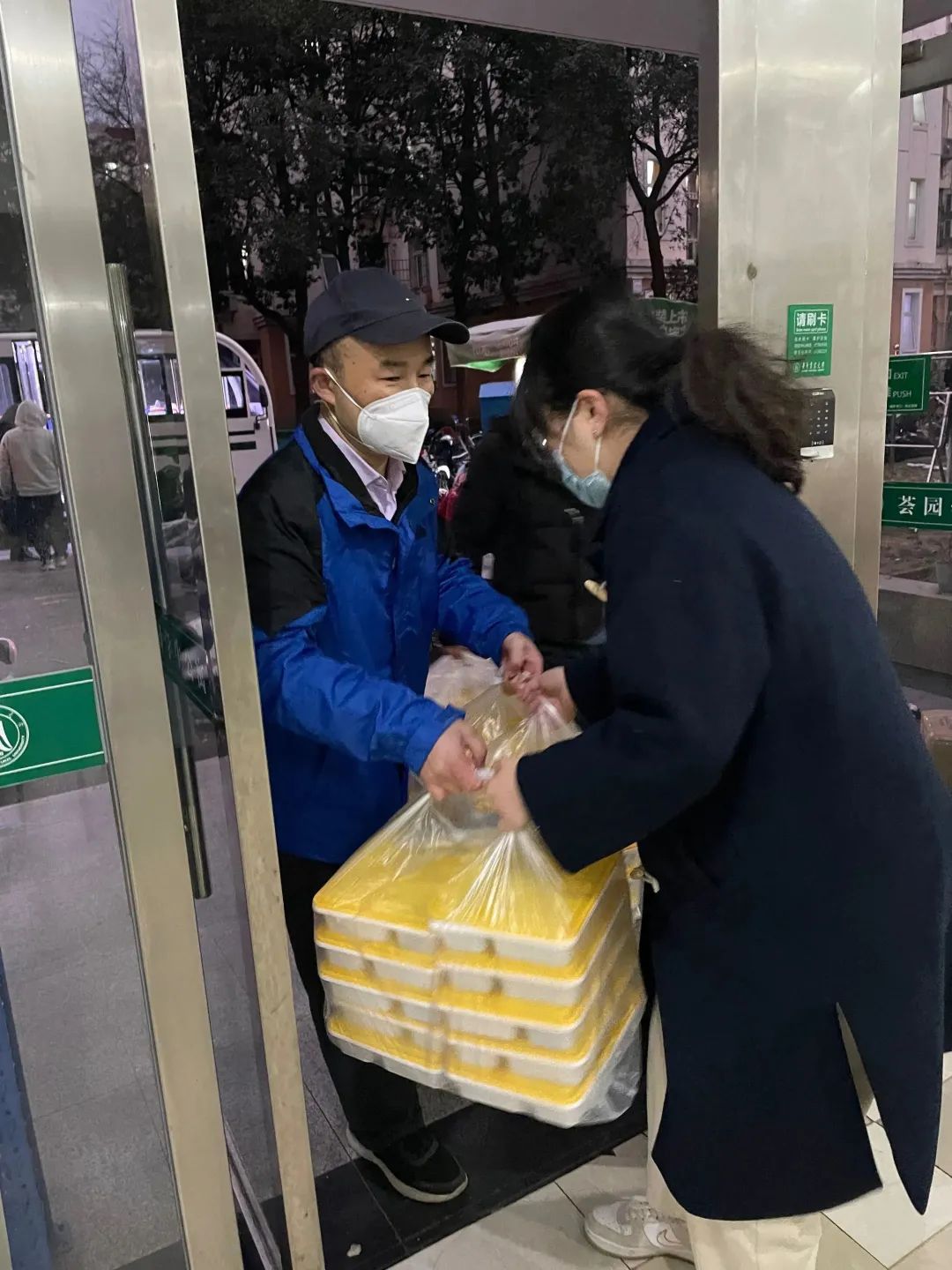 他们齐心协力,共同合作,有的老师在协助将饭菜装盒,有的老师负责饭盒的运输,有的老师负责饭盒的分发。楼栋里还有上下多次楼层的志愿者同学们接应,在一天的三个饭点,同学们能及时吃到可口的饭菜,都是他们在背后默默付出的结果。