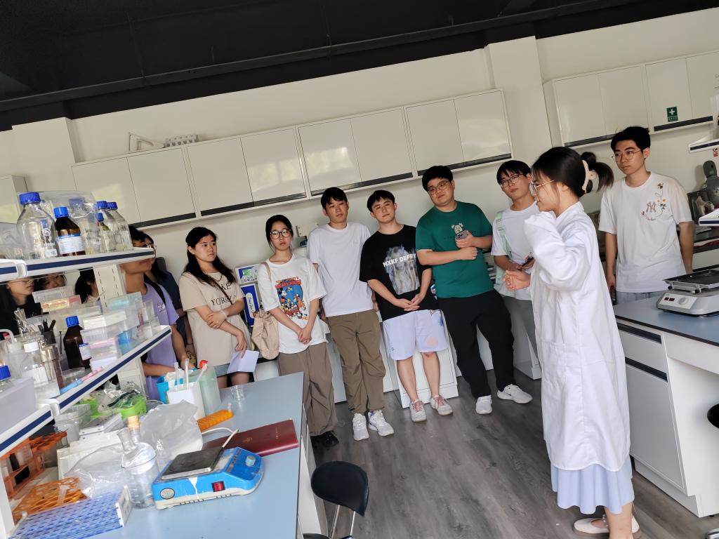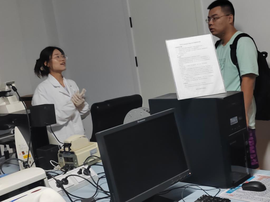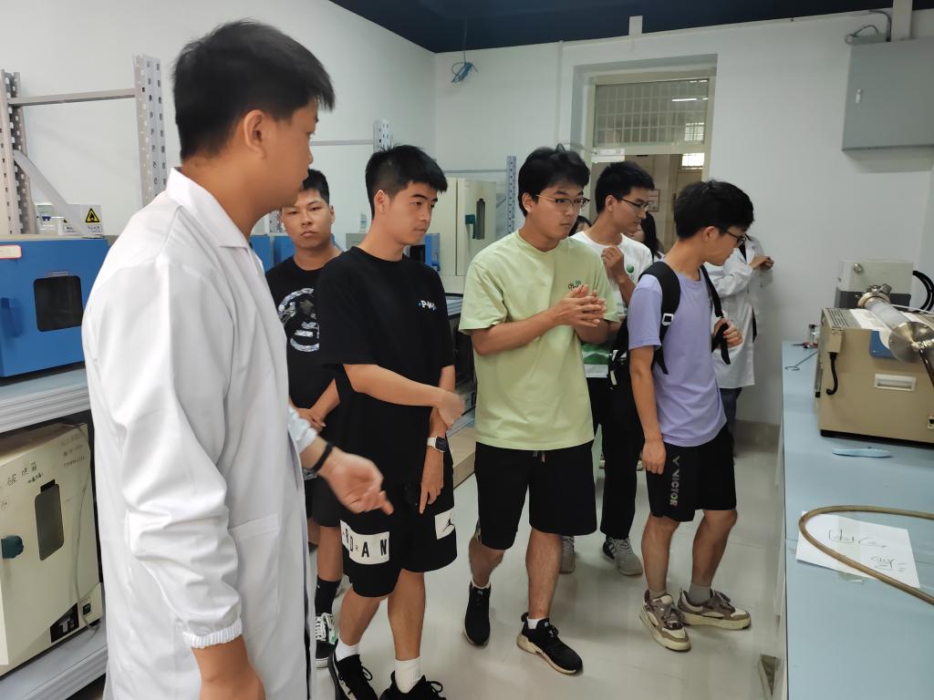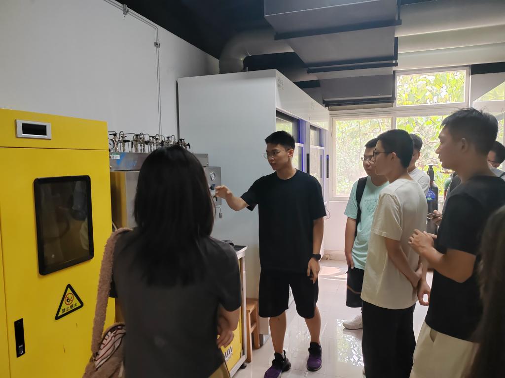 之后,同学们分别前往五楼、四楼、二楼的实验室进行参观。参观过程中,杨成冰、易歌、王杨灿、谢保生等同学分别介绍了各自所在实验室的研究方向以及相关实验仪器使用方法,让研究生新生们对各个实验室有了更深入的了解。