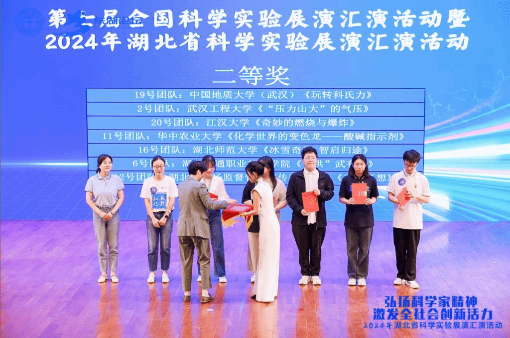 10月11日,第七届全国科学实验展演汇演活动暨2024年湖北省科学实验展演汇演活动在中国地质大学(武汉)举行。由我院段丽君、叶小舟老师指导的田雨、赵雅楠、刘亚柠、侯庆哲四位同学组成的“化学变色龙”队荣获二等奖。