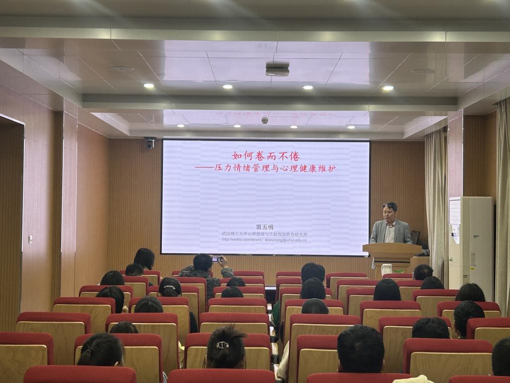 (通讯员 李秋连 廖英飞)为了全面深化我院师生心理健康教育工作,提升师生情绪调节能力,学院于11月7日在化学楼A102报告厅开展主题为“如何卷而不倦——兼谈压力应对和情绪调适”的心理培训讲座。本次讲座特邀武汉理工大学心理健康与生涯发展研究所所长、特聘教授雷五明作为主讲嘉宾,由yl9193永利集团副院长周静舫主持,学院研究生导师代表、众多研究生以及本科生心理委员到场学习。