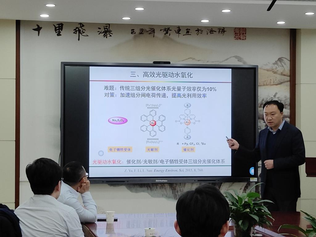 报告中,李斐教授首先介绍了太阳能分解水制氢的研究背景,提出了模拟光合作用体系太阳能分解水制氢的构想,要模拟光合作用体系,首先要开发高活性分子水氧化催化剂,最终目标是实现太阳能燃料的制备。报告中,李斐教授首先介绍了化学法水氧化,高效光驱动水氧化,构建染料敏化光阳极,构建杂化光阳极等常见的制氢方法,最后提出了模拟氢化酶制氢的方法。李斐教授详细介绍了其团队研究的分子水氧化催化剂的特点,利用超分子自组装促进溶液电荷传递,光量子效率获得提升;空穴传输层促进电极表面电荷传递,提升染料敏化光阳极稳定性;创新电极组装方式,半导体-分子催化剂杂化光阳极展现出优异的性能。整个报告层次清晰,老师和同学们全神贯注,受益匪浅。