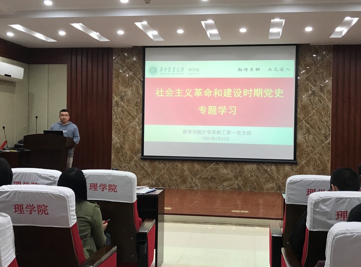 4月22日下午,数学与统计学系教工第一党支部在逸夫楼A109会议室召开党员大会,集体学习了社会主义革命和建设时期党史及习近平总书记在清华大学考察时的重要讲话精神,会议由宣传委员韩群同志主持。