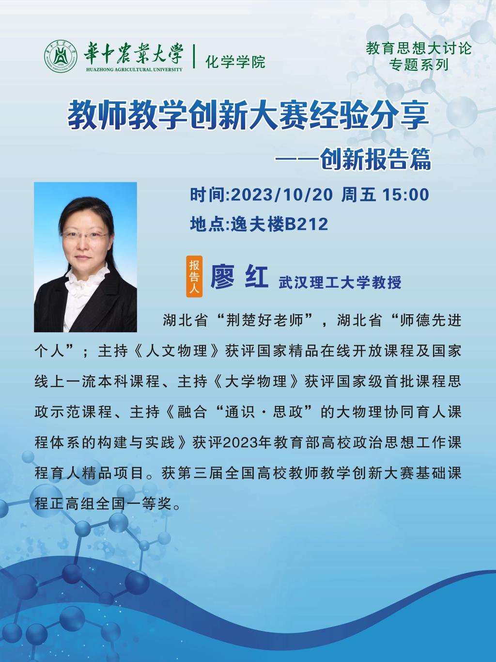 此次会议主要围绕“如何实现教学创新”为主题做经验分享。廖红教授首先联合自己的教学和参赛经历做出了两点总结:一是要重视比赛,反复练习、反复修正。二是要善于总结经验,重视现场发挥。并说道:“请不要相信,胜利就像山上的蒲公英一样,唾手可得!但是请相信,世上总有一些美好值得我们全力以赴!”