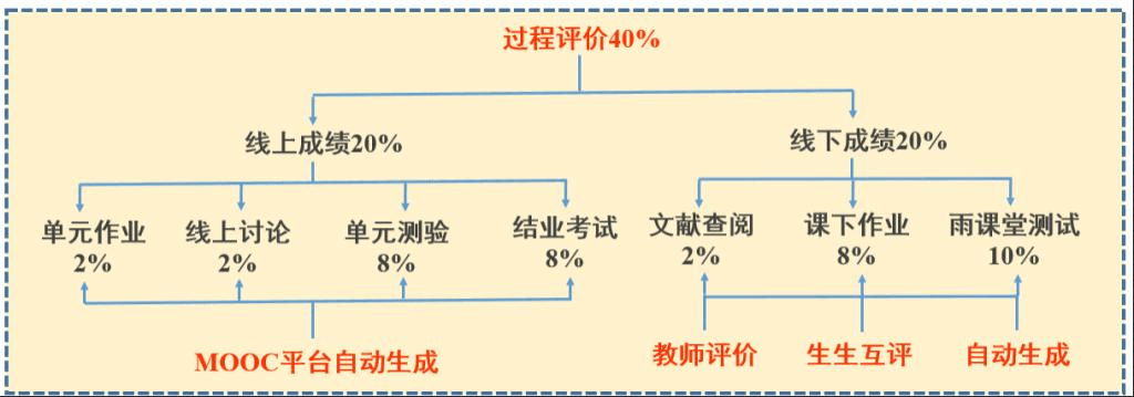 由注重结果性考核转变为过程考核与结果并重的考核评价模式,总评成绩= 40%(过程评价)+ 20%(期中考核)+ 40%(期末考核)。过程评价40%包括线上学习+线下学习两部分,线上学习占20%,包括线上单元测试、讨论等内容;线下学习占 20%,其中雨课堂测试占10%,课下作业和课外查阅占 10%(图1)。考核方式多元化有效激发了学生的学习兴趣,增强了学生的自主学习能力,促进了学生的全面发展,提高了学生的综合素质。